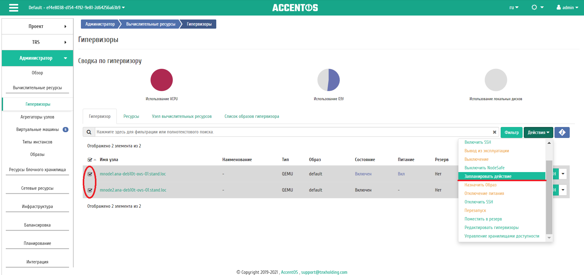 Выберите необходимый гипервизор и вызовите действие: