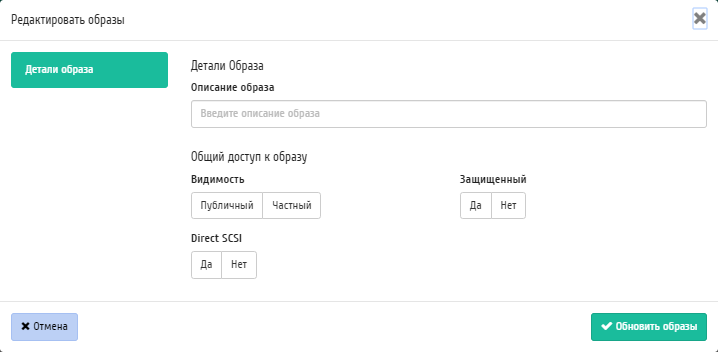 | Видимость | Показывает, публичен ли образ или снимок. Публичные доступны всем, непубличные - только в рамках проекта, в котором созданы. |