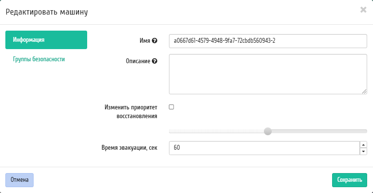 Функция позволяет редактировать имя, описание и назначенные группы безопасности выбранной машины. Доступна в общем списке всех машин. После вызова действия в открывшемся окне задаем необходимые параметры: