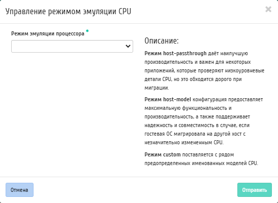 Host-passthrough- эмулируется полный набор инструкций процессора узла кластера;Host-model- эмулируется набор инструкций семейства процессоров, к которому принадлежит процессор узла кластера;Custom- эмулируется поддерживаемая модель процессора, заданная пользователем.