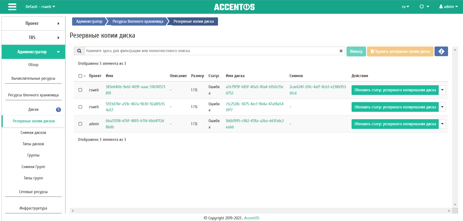Вкладка «Резервные копии диска» отображается только при значении True параметра enable_cinder_backups в конфигурационном файле модуля Dashboard.