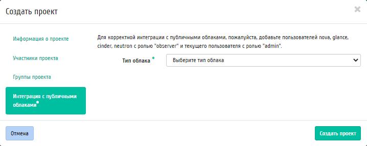 Вкладка не отображается, если для проекта не настроена интеграция с публичными облаками.