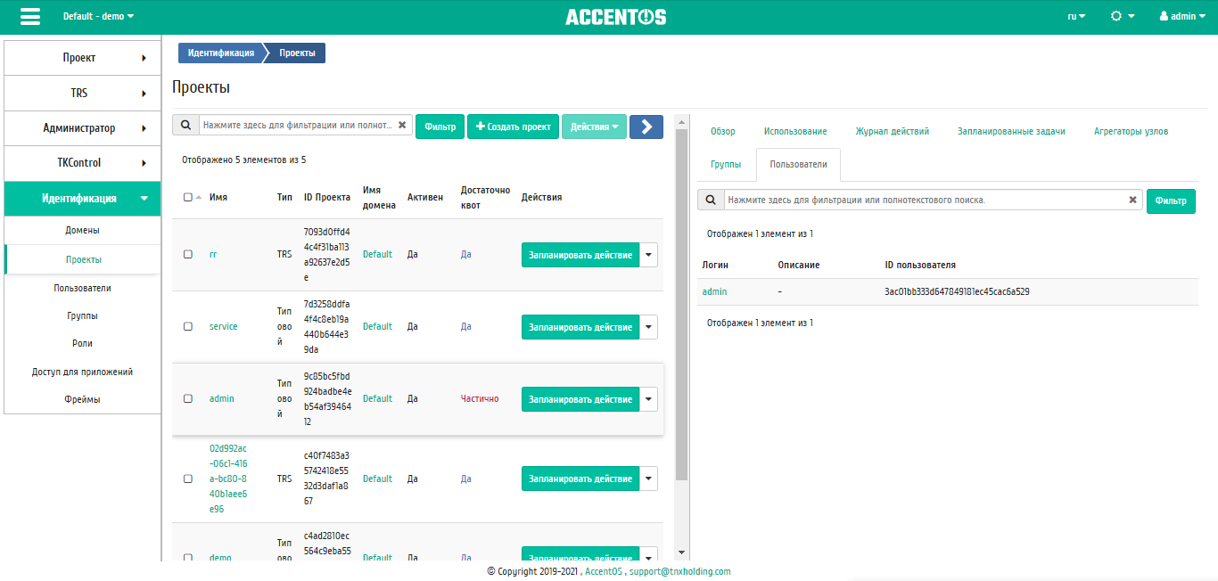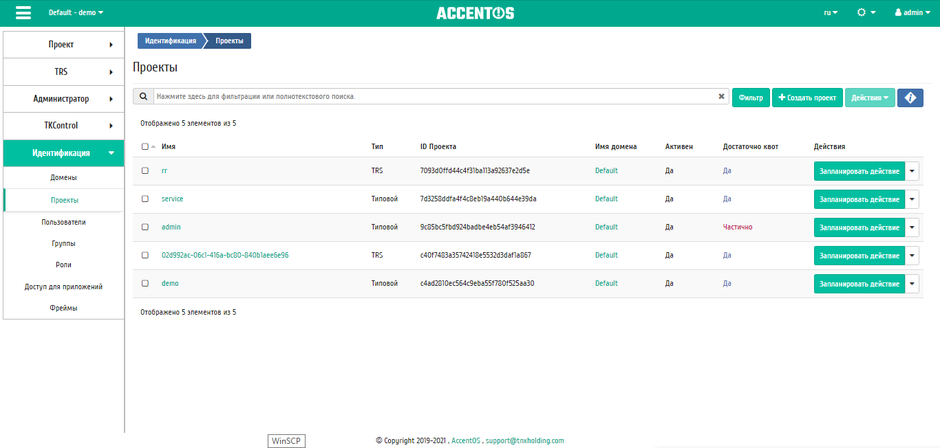 2 Заблокировать Изменение состояние проекта с активного на неактивный. Действие недоступно для текущего проекта и сервисного проекта.