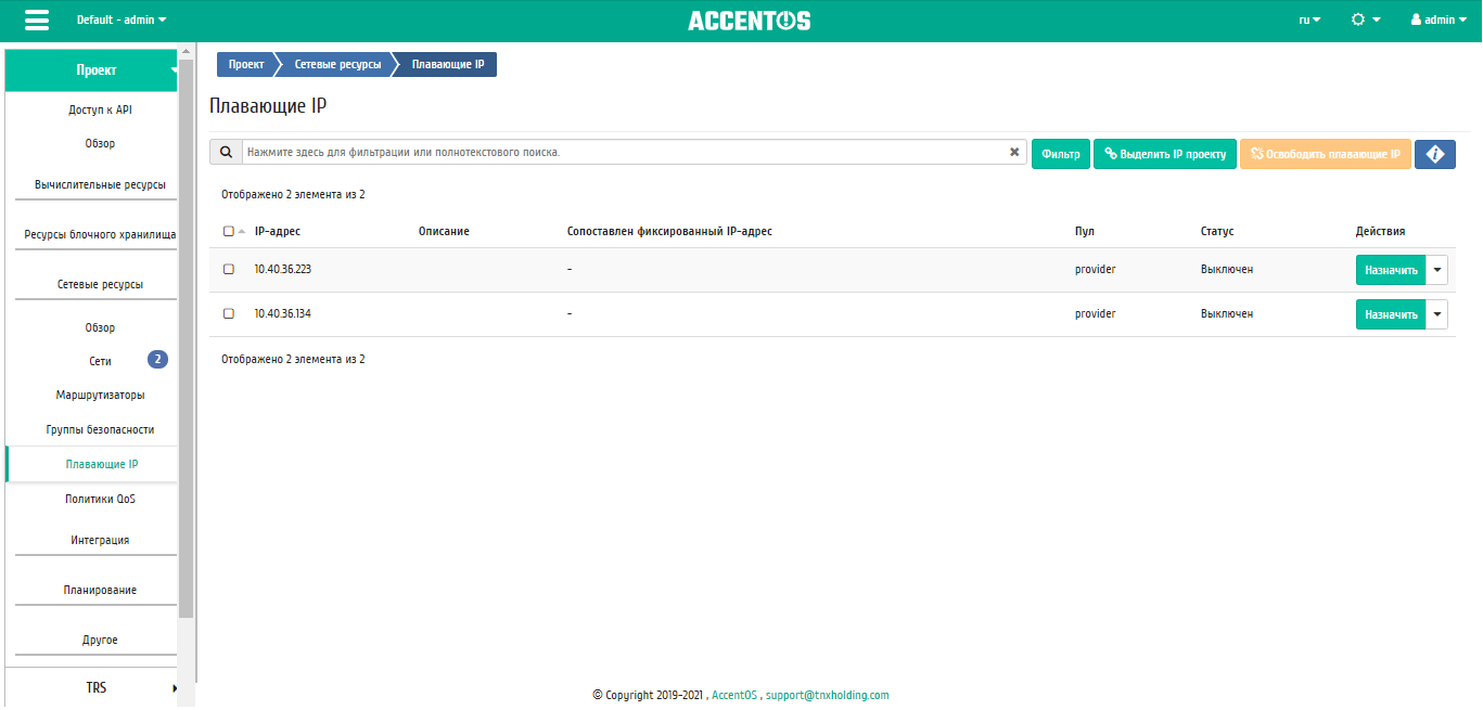 | 1 | Выделить IP проекту | Выделение плавающего IP-адреса. |
