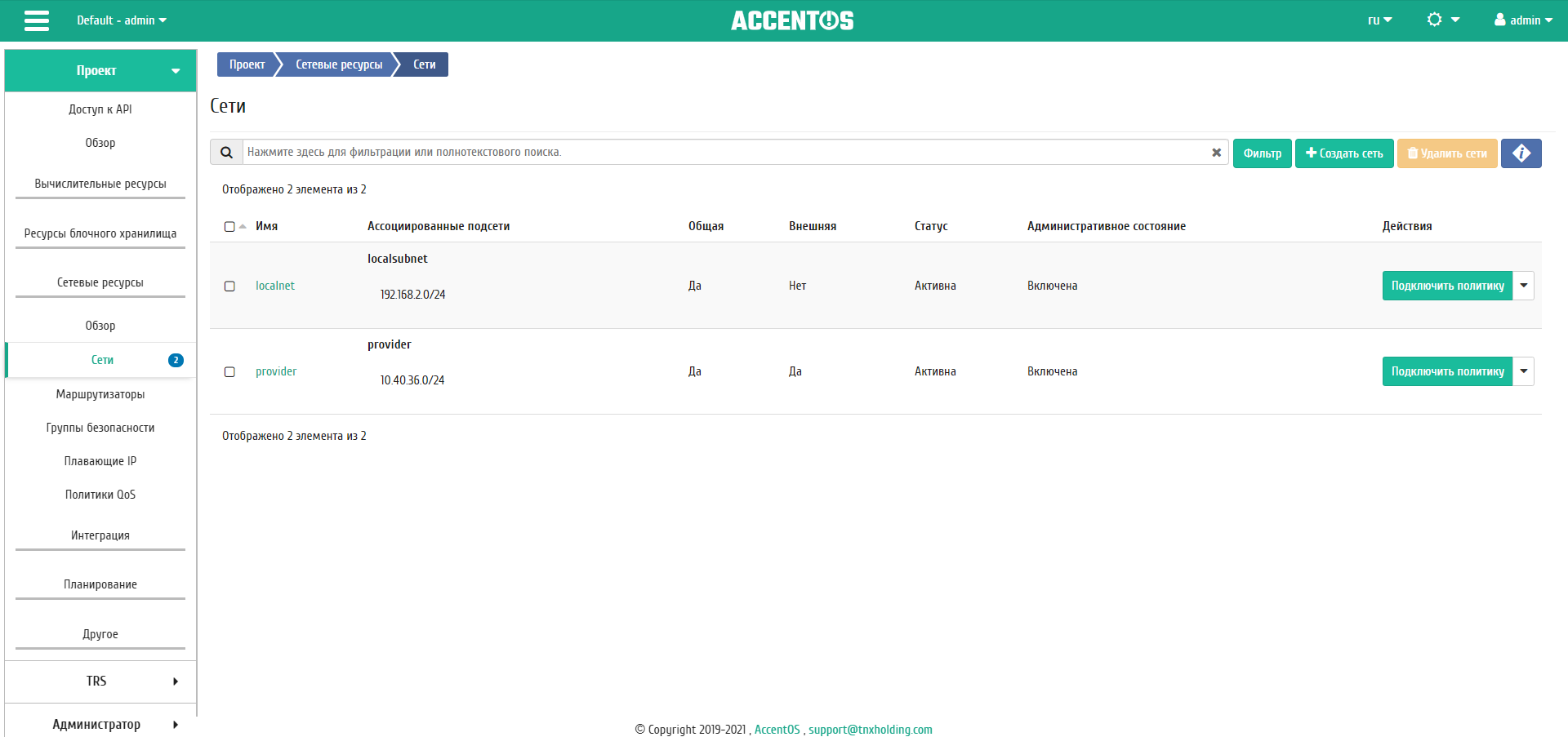 | Имя | Имя сети может быть задано пользователем произвольно. Также является ссылкой для перехода к детальной информации сети. |