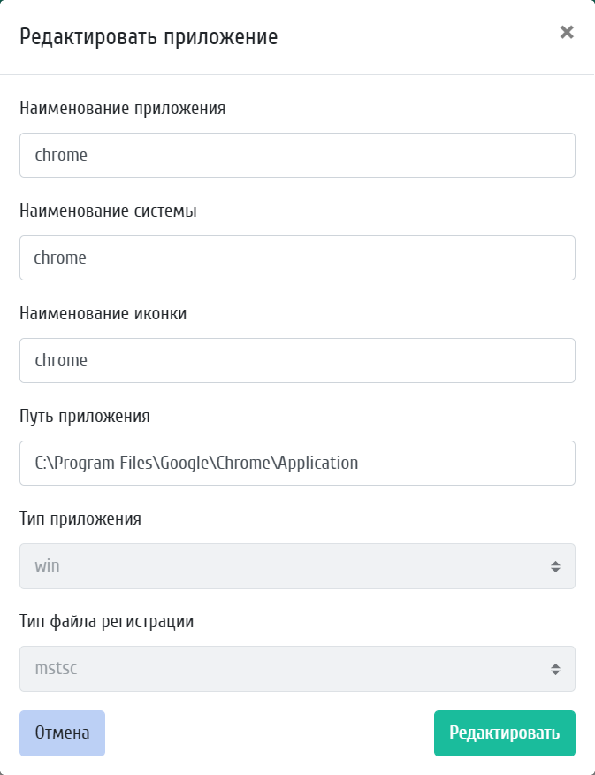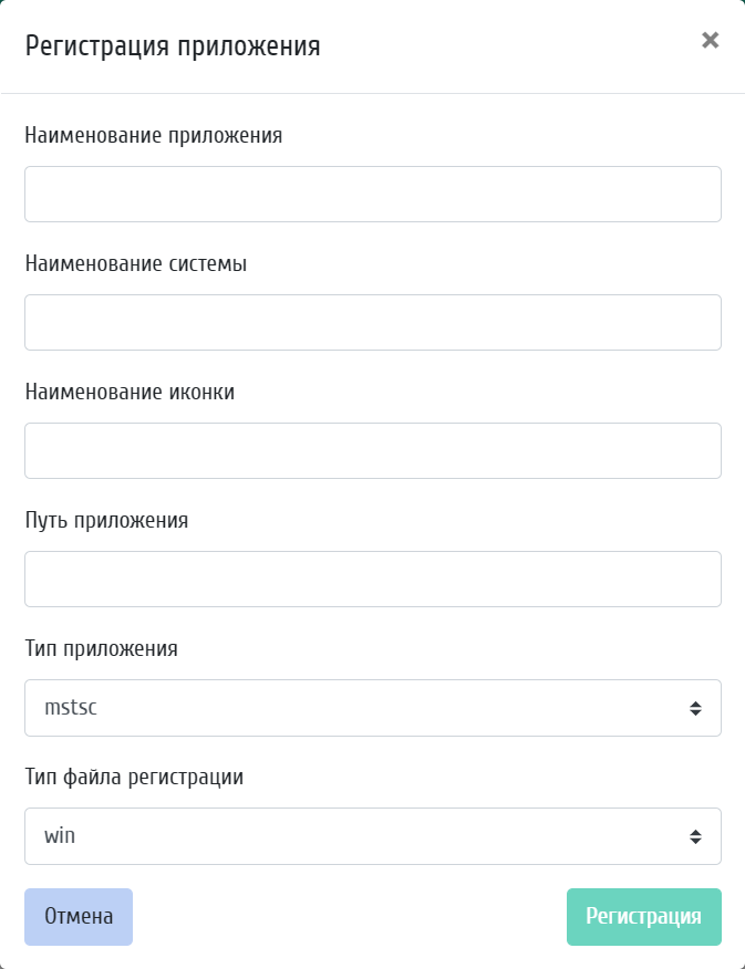 Наименование приложения– Имя приложения в свободной форме;Наименование системы– Имя приложения в системе (например, skype);Наименование иконки– Название иконки приложения (например, Skype);Путь приложения– Путь до приложения в системе (например, C:pathskype.exe);Тип приложения– Тип доставляемого приложения. Типы регистрируются после установки приложения. В настоящее время имеется только один типmstsc;Тип файла регистрации– Тип доставляемого файла регистрации приложения. Типы регистрируются после установки приложения. В настоящее время имеется только один типwin.