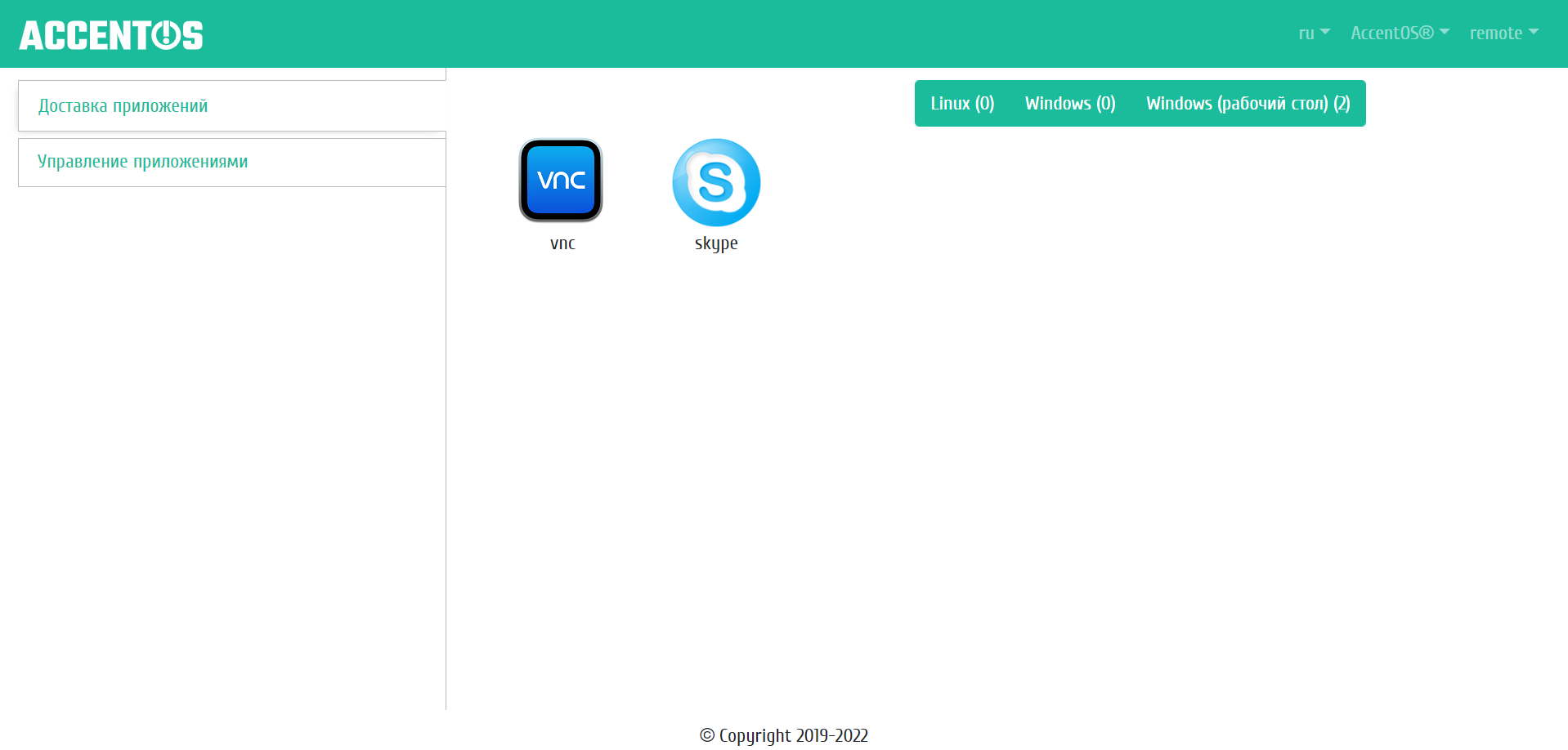 В левой части расположено главное меню графического интерфейса, доступны две вкладки для администратора: «Доставка приложений», «Управление приложениями» и одна вкладка «Доставка приложений» для обычного пользователя.