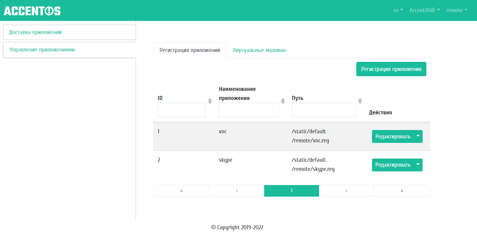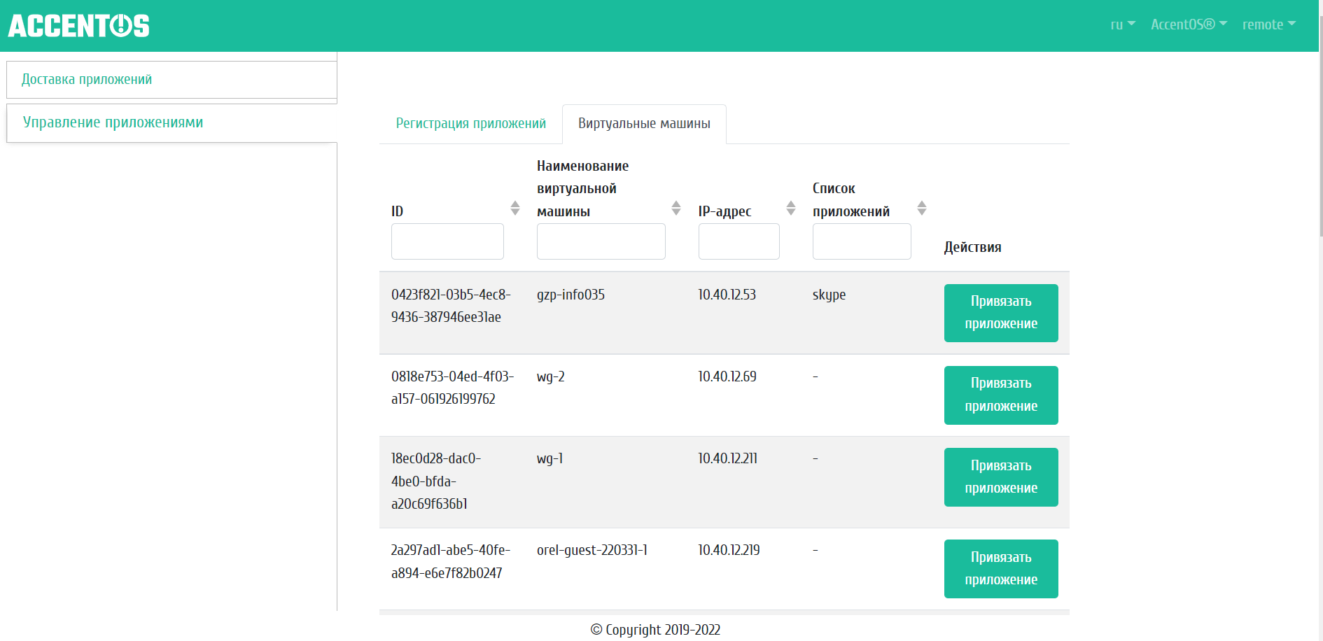 На вкладке «Управление приложениями» доступны две внутренние вкладки: «Регистрация приложений» и «Виртуальные машины».