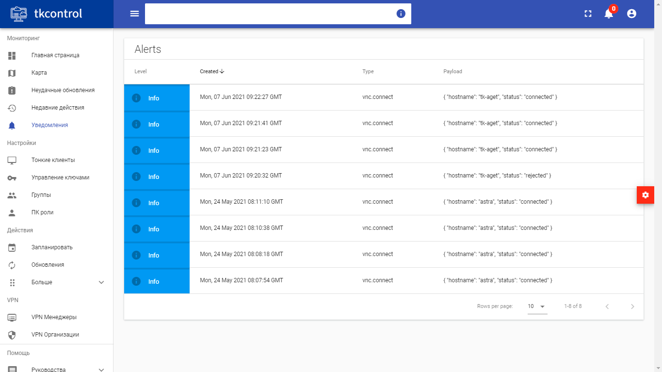 Вкладка отображает список уведомлений о подключениях к тонким клиентам: