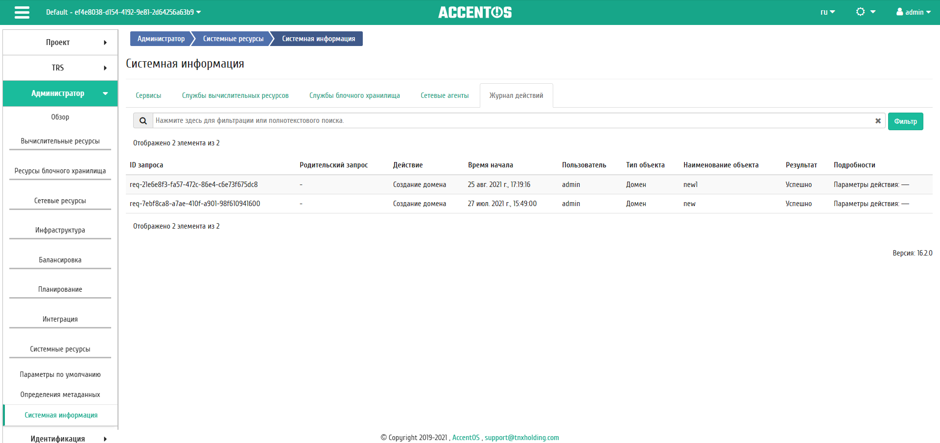 На вкладке «Журнал действий» отображаются наиболее важные произошедшие события.