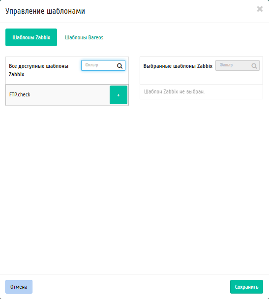 Функция доступна в общем списке всех машин. Позволяет управлять шаблонами системы мониторинга Zabbix и системы резервного копирования Bareos. На вкладке «Шаблоны Zabbix» настраивается необходимый набор шаблонов мониторинга Zabbix, после сохранения мониторинг будет производиться по выбранным шаблонам: