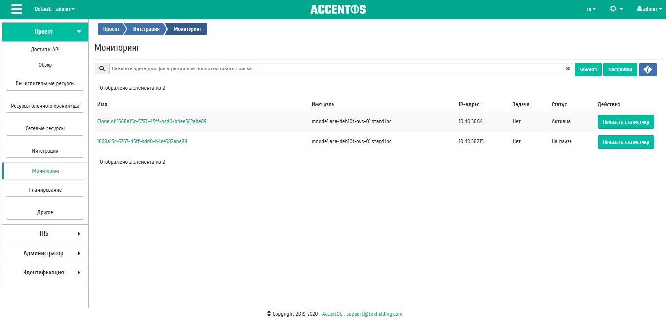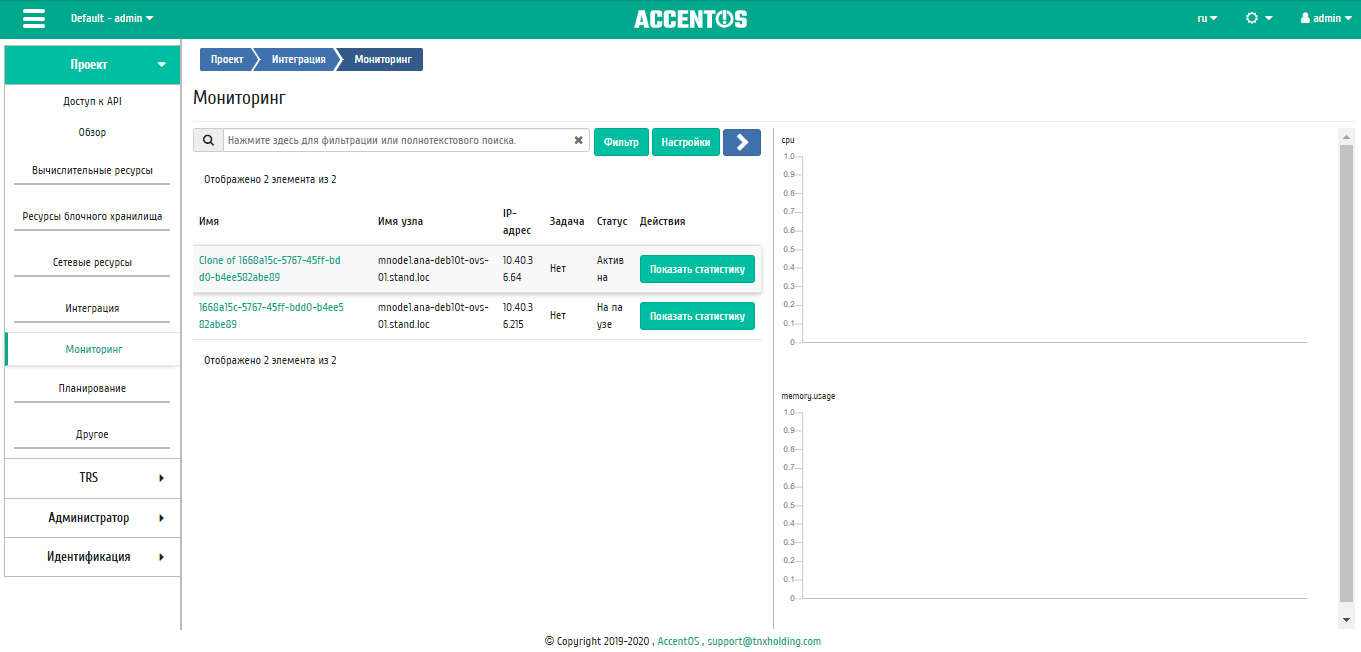 Шаблоны Zabbix будут доступны, если для проекта виртуальной машины ранее был настроен мониторинг. Настроить мониторинг можно во вкладке «Идентификация»/«Проекты», при помощи функции «Настройка мониторинга».