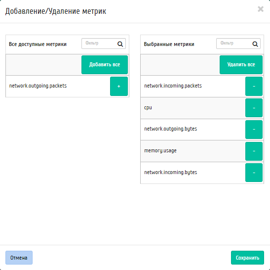Функция доступна в общем списке всех машин. Позволяет управлять всеми доступными метриками: