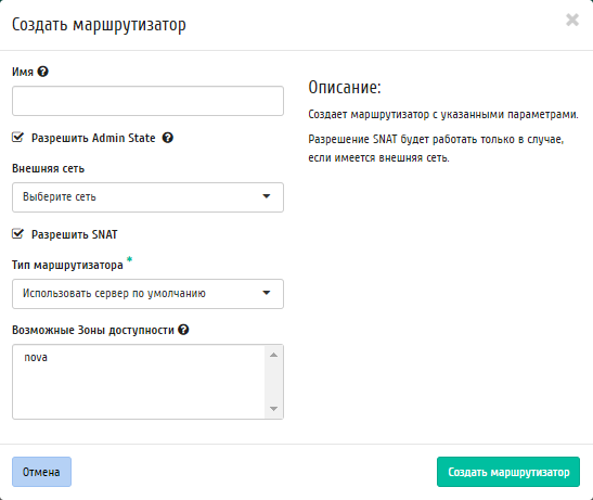 В общем списке сетей на панели управления кнопкой «Создать маршрутизатор» открываем мастер создания маршрутизатора: