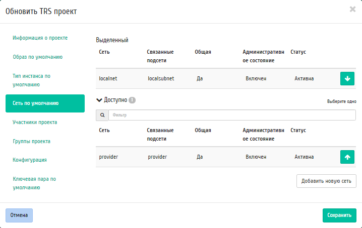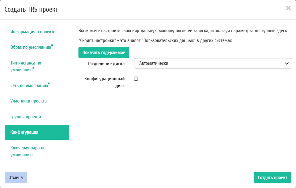 Вкладка отображается только для TRS проектов, которые интегрированы с публичными облаками.