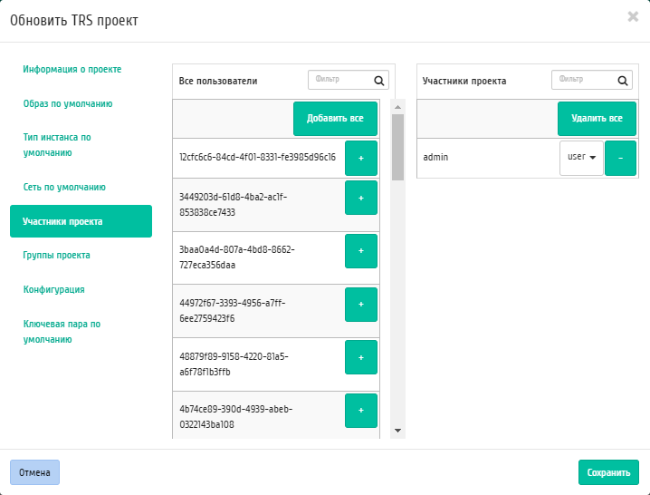 - Все пользователи - перечень всех доступных пользователей TRS проекта;