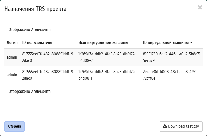 Функция позволяет получить информацию о назначениях пользователей на машины TRS проекта. После вызова действия в открывшемся окне отображается следующая информация: