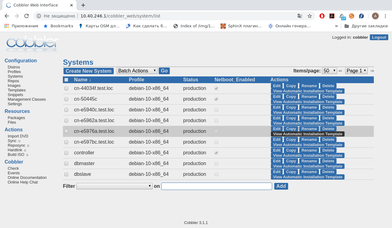 , где serverip - IP-адрес сервера cobbler, авторизуйтесь в системе, используя логин и пароль, и выберите пункт Systems в разделе Configuration.Затем перейдите в раздел Systems и нажмите кнопку “Create New System”: