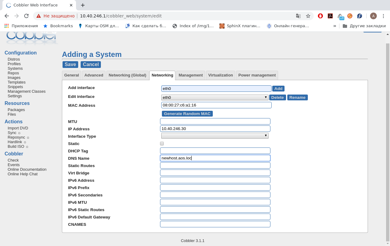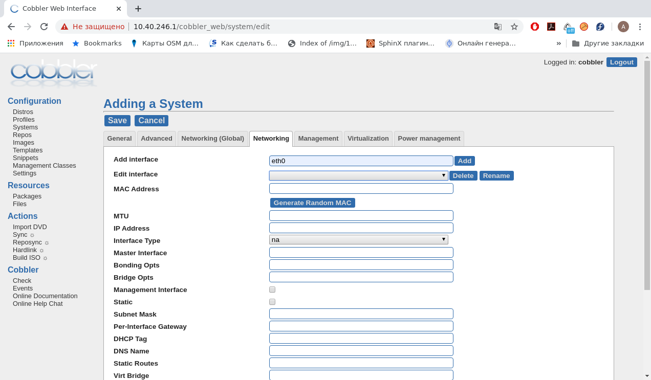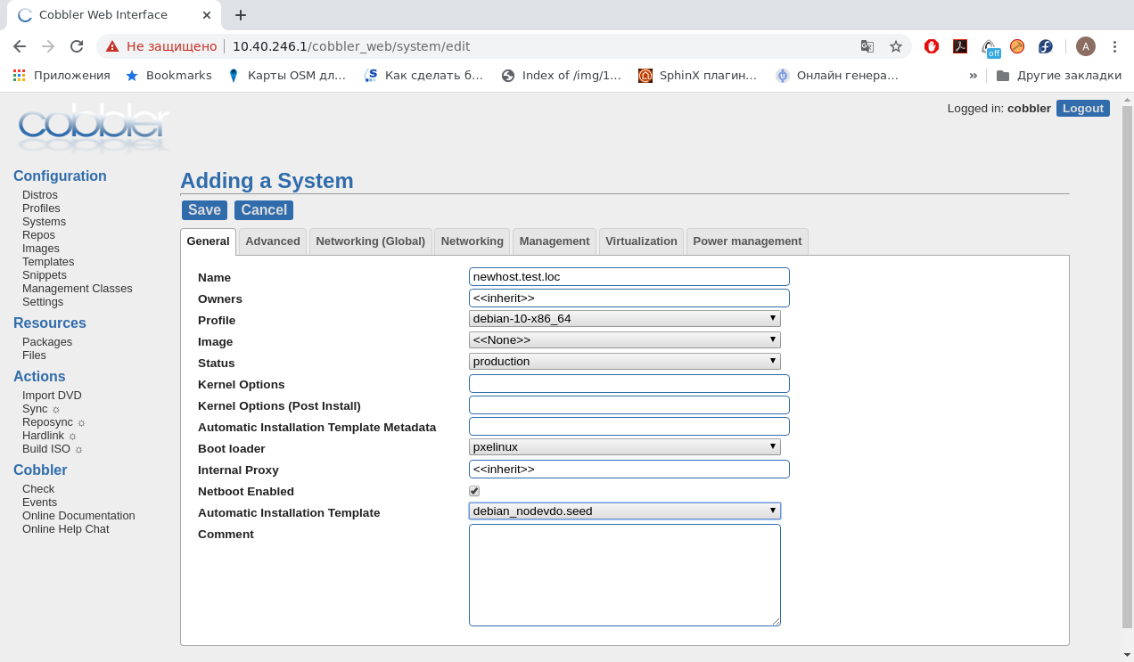 Затем введите имя системы на вкладке “General” так, как оно будет выглядеть в Cobbler. Для уникальности создайте имя по шаблону “cn-шесть последних символов из MAC.test.loc”. Имя контроллера будет равно - controller. Затем обязательно выберите:
