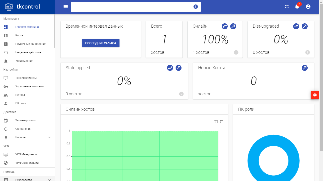 На вкладке наглядно отображается информация о количестве и состоянии узлов, онлайн хостов, ПК ролей. Данные представлены в круговых диаграммах и в виде графика.