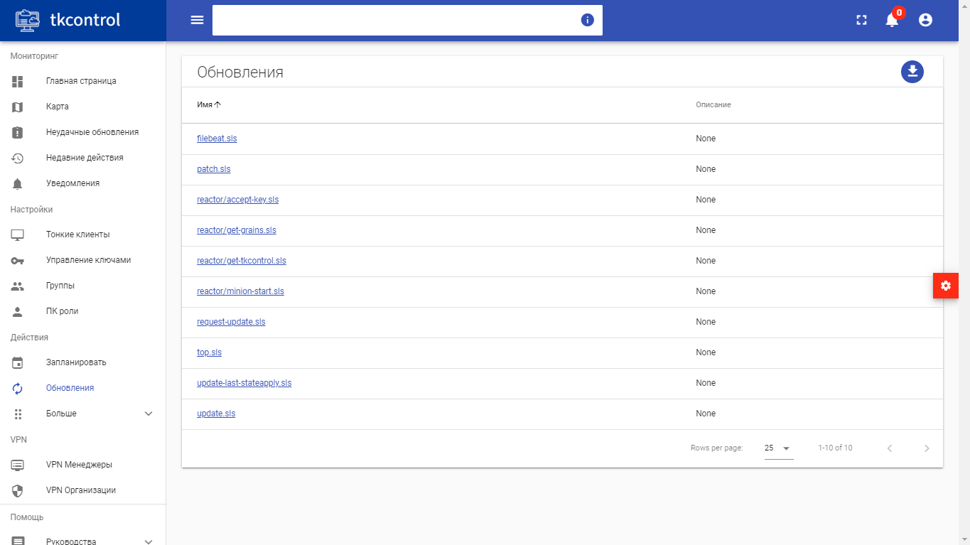 Отображает список обновлений тонких клиентов.